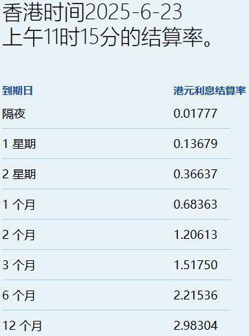 六个月及一年期拆息分别报2.21536%和2.98304%,但隔夜息微降至0.01777%,见6月4日后最低。